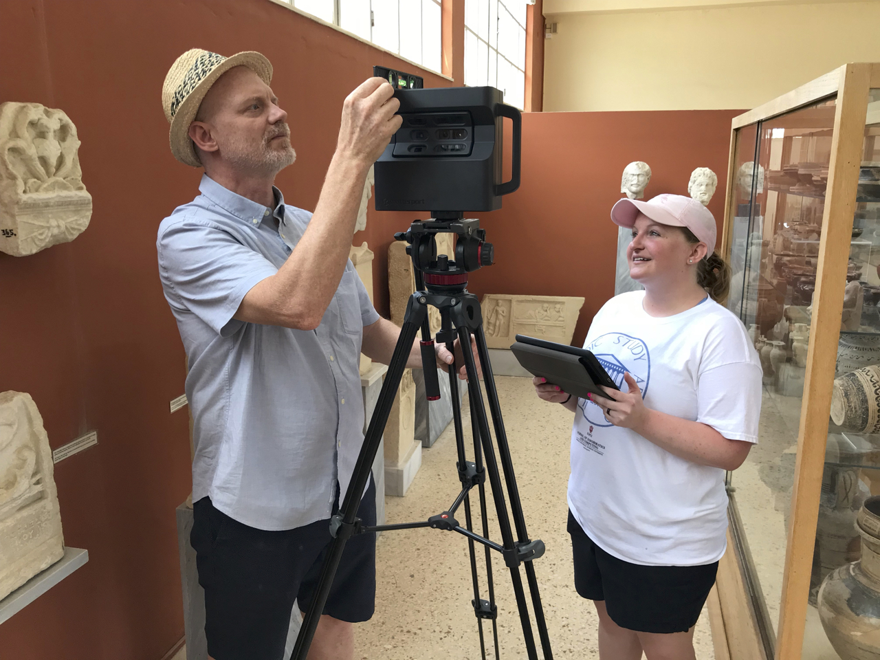 Working with a student and the Matterport camera to scan the Paros Archeological Museum.